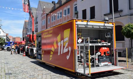 Die Feuerwehr Aichach stellte hier den Rüstwagen, das Wechselladerfahrzeug mit Abrollcontainer Wasser-Schaum, sowie den Kommandowagen aus. Ebenso wurde das neue Konzept des „Brandmeister vom Dienst“ vorgestellt. Mit dem Kran des Wechselladerfahrzeugs, der zum Fahnenmast umfunktioniert wurde, konnte von weitem auf unseren Stand aufmerksam gemacht werden.
