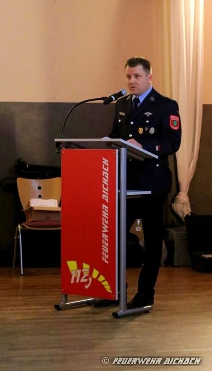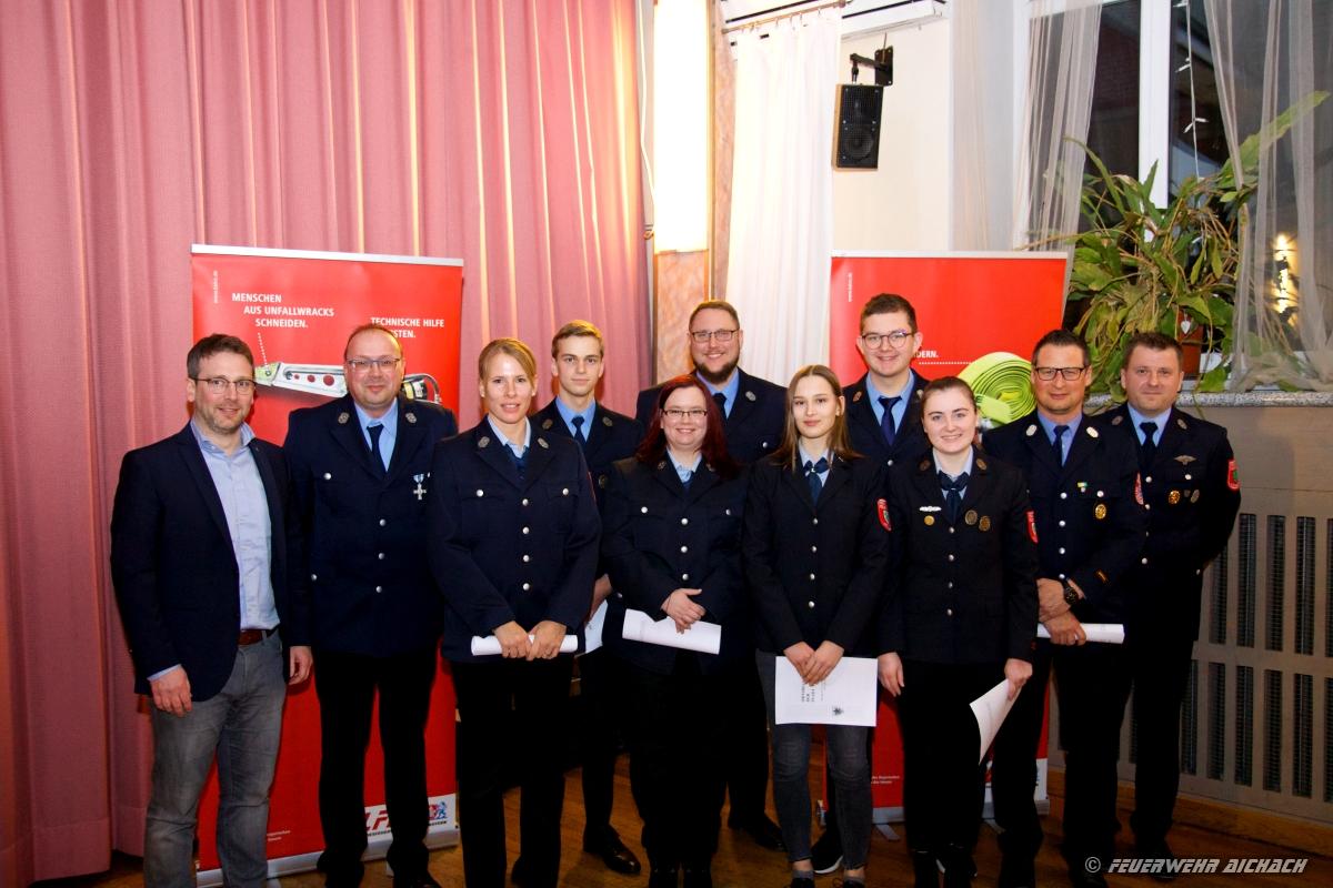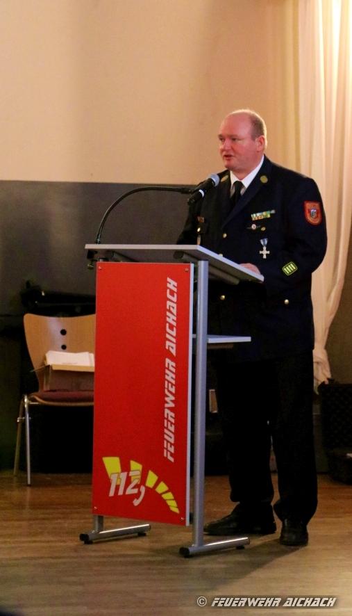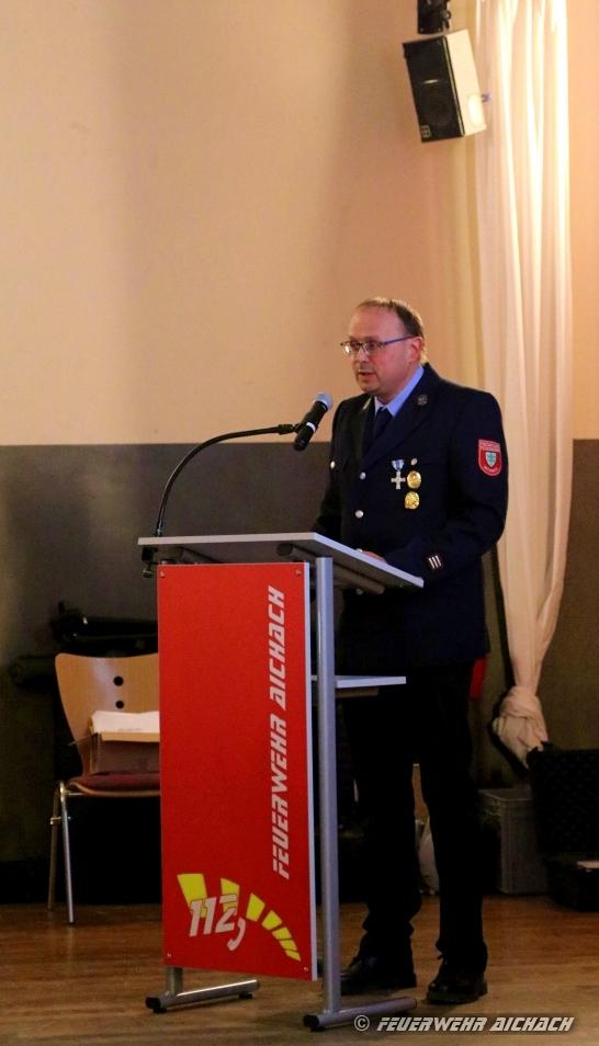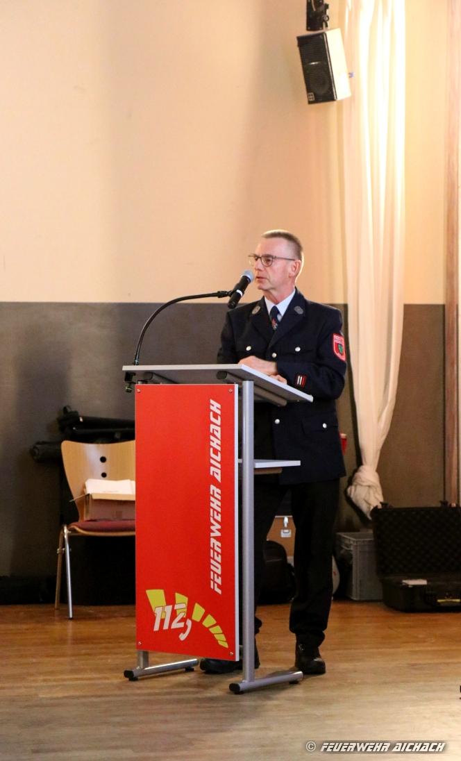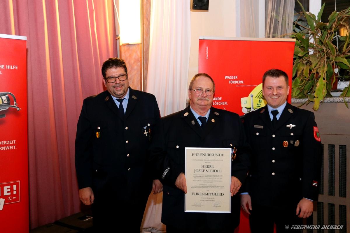 Im Weitern Verlauf der Versammlung erfolgte die Verpflichtung neuer Kameraden sowie Ehrungen und Beförderungen. Josef „Beppo“ Steidle wurde nach 49 Jahren aktiver Dienstzeit in den Ruhestand verabschiedet und aufgrund seiner außergewöhnlichen Leistungen um die Feuerwehr Aichach zum Ehrenmitglied ernannt. Kreisbrandrat Christian Happach ehrte Steidle ebenfalls mit den Ehrenkreuz des Kreisfeuerwehrverbandes in Gold. „Beppo, du hast es mehr als verdient“, so Happach.
