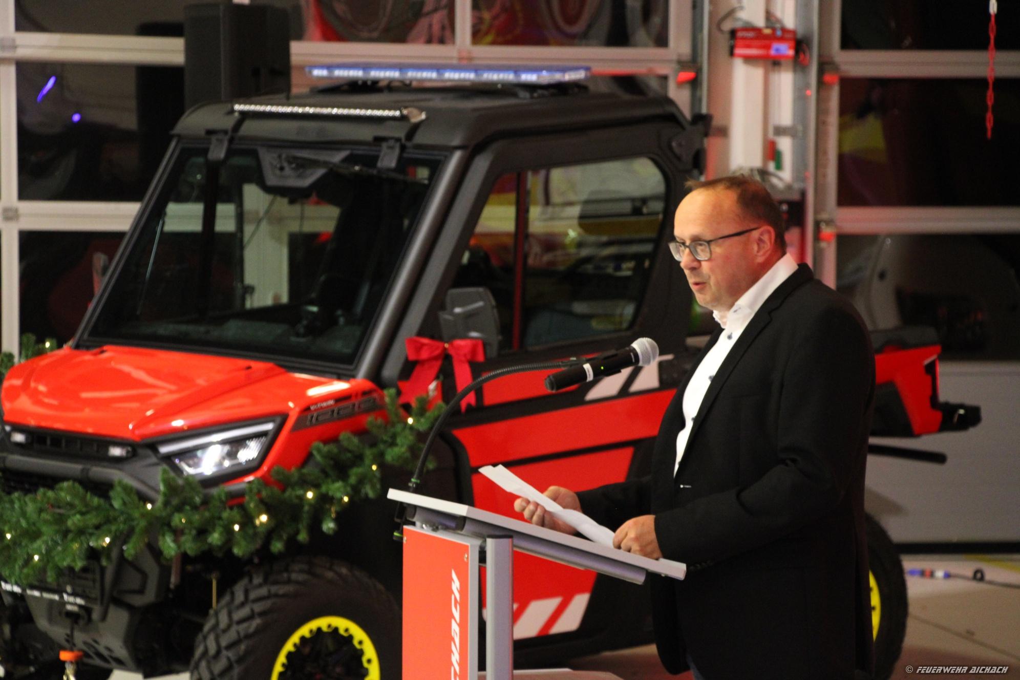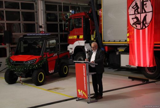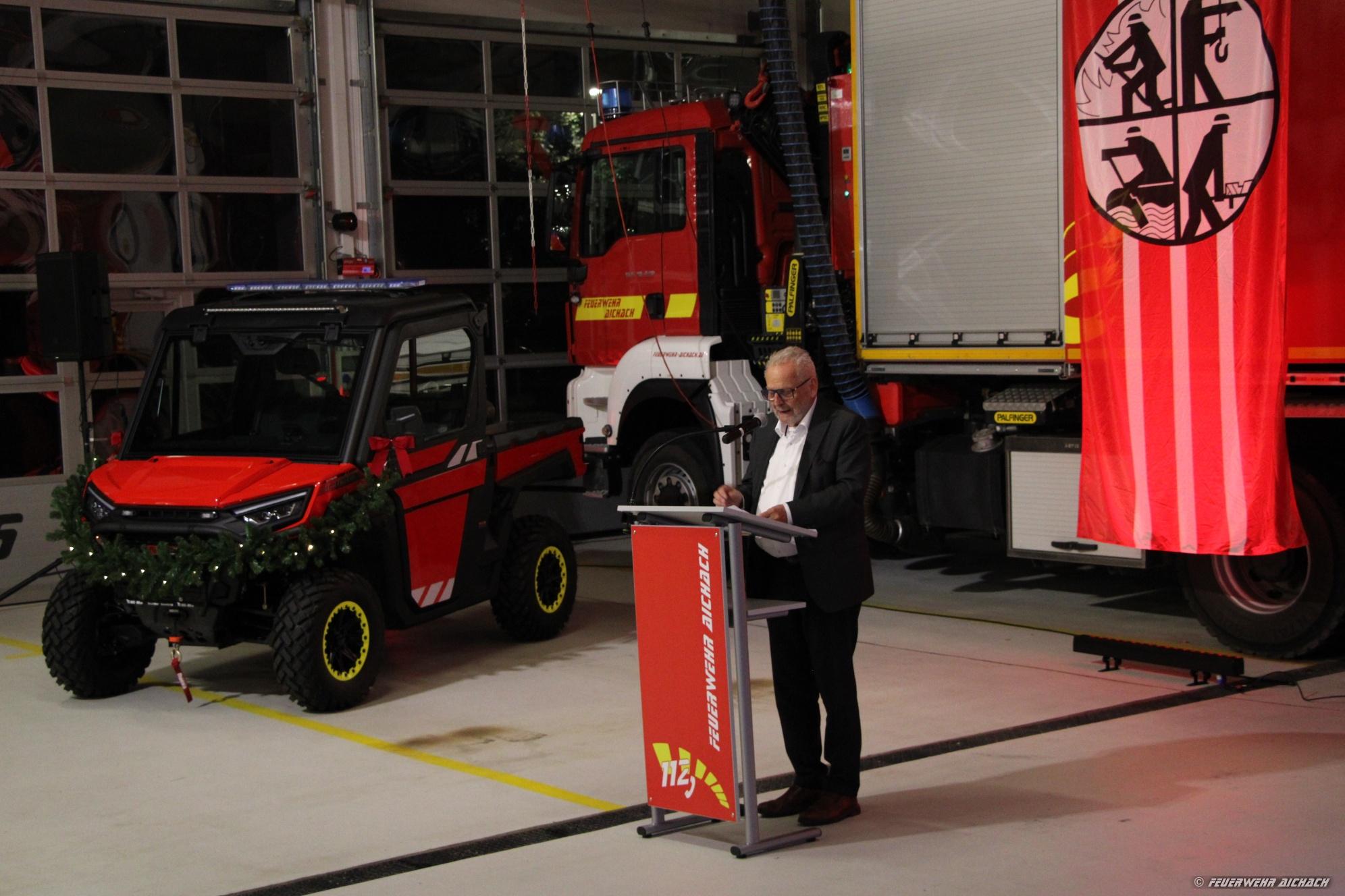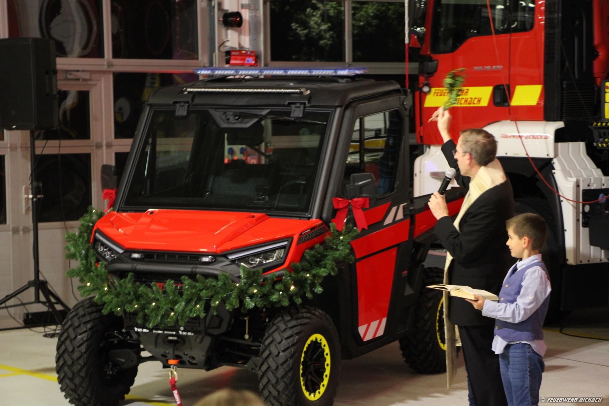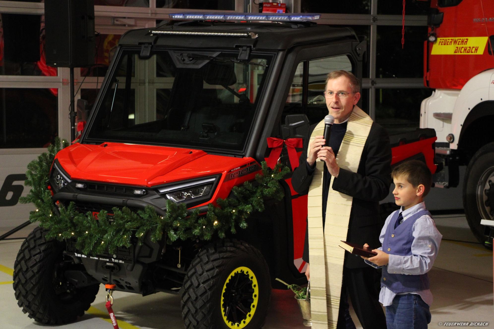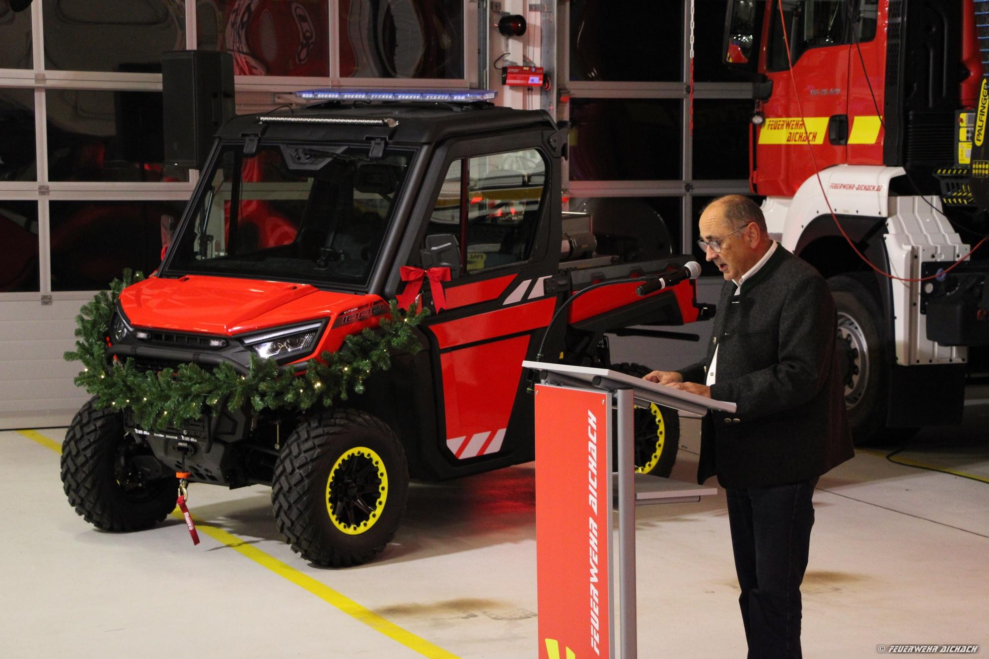 Anschließend erläuterte Kommandant Werner Mayer technische Daten zum Fahrzeug und schilderte die zukünftigen Einsatzzwecke des neuen Geräts. Im Anschluss erfolgte die Weihe des UTV durch den Geistlichen. Pfarrer Herbert Gugler hob in seinen Ausführungen das ehrenamtliche Engagement der Feuerwehrdienstleistenden hervor und bat um den Segen für alle die mit diesem Fahrzeug arbeiten und unterwegs sind, ehe er das UTV weihte.