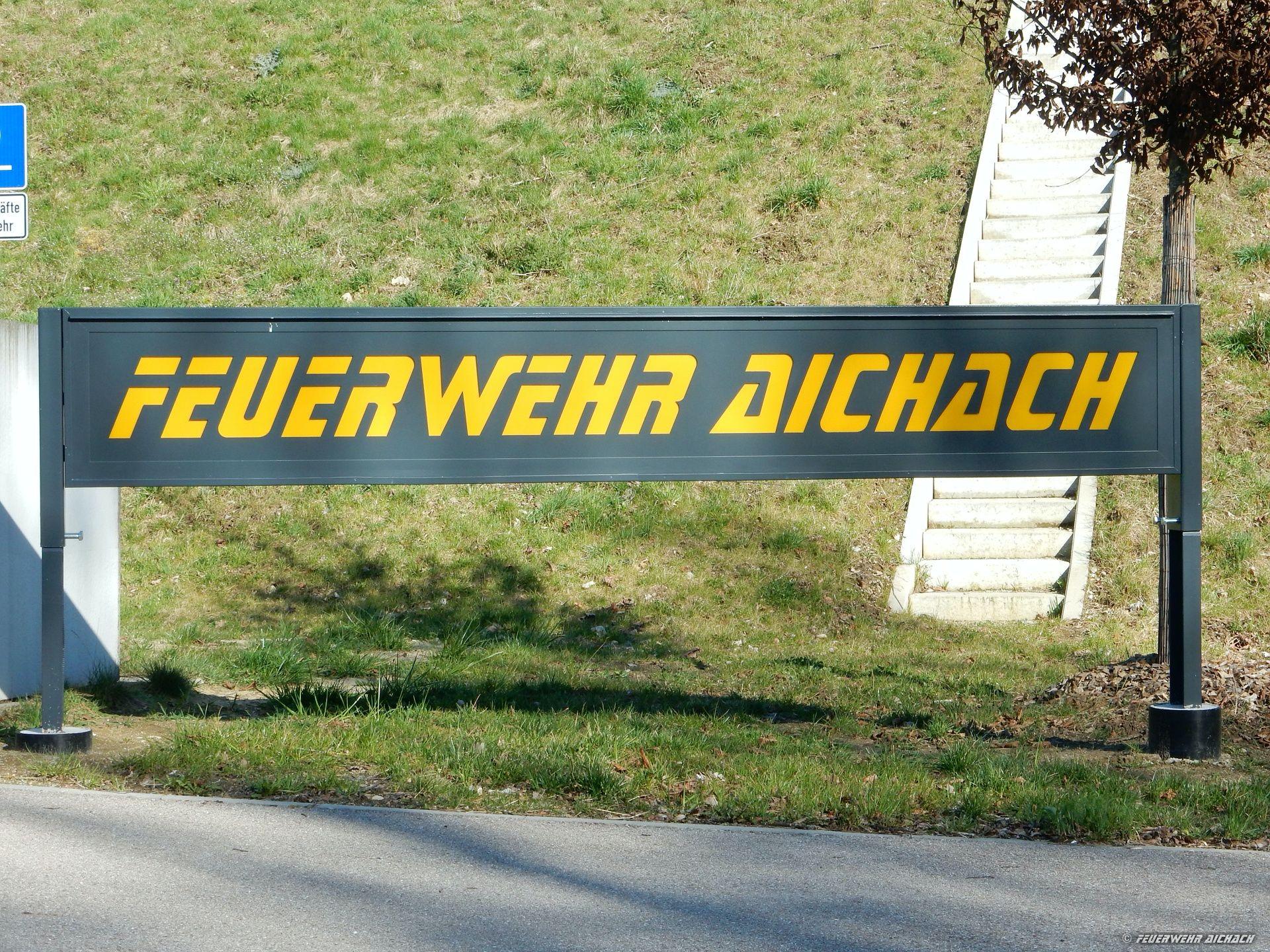 Auf Initiative der neu gewählten Vorstandschaft sollte der Schriftzug im „Corporate-Design“ der Feuerwehr Aichach neu hergestellt werden, ebenso entschied man sich für einen gelben Hintergrund, der ebenfalls aufgrund der Abnutzung des alten neu beschafft werden musste.