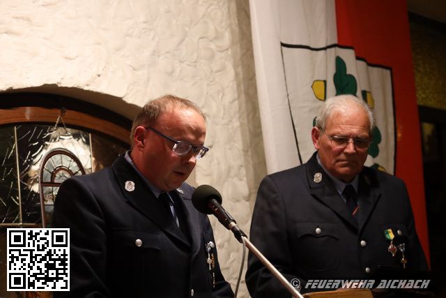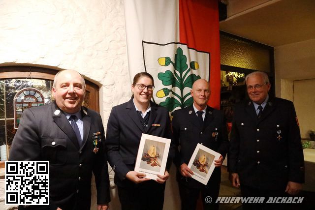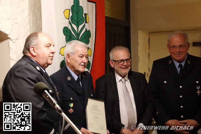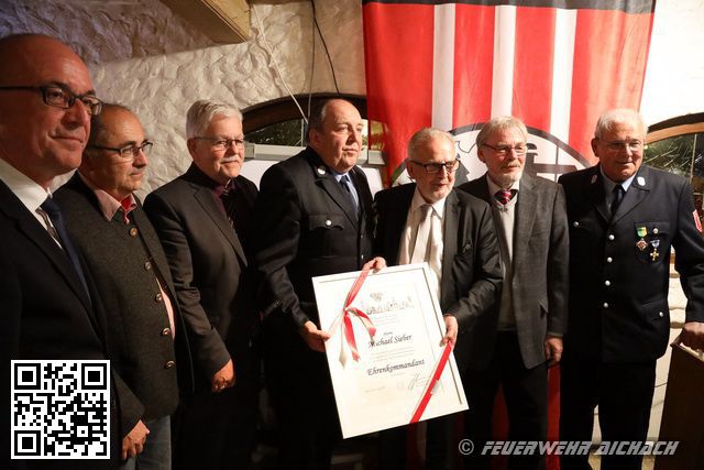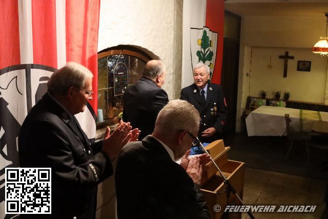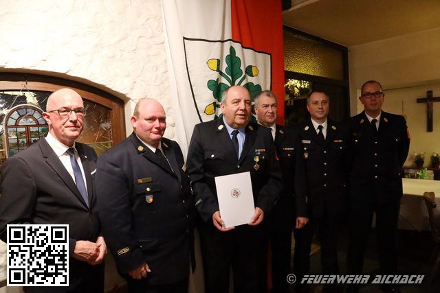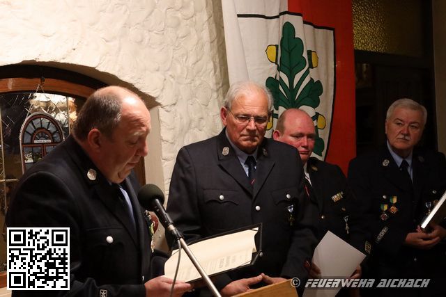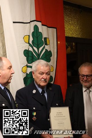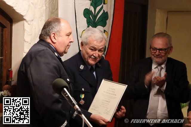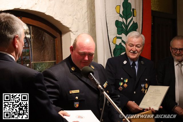 Der langjährige Kassier Hans Wassermann wurde in der Generalversammlung für 30 Jahre Kassier geehrt. Der scheidende Vorsitzende Hannes Ziegler wurde zum Ehrenmitglied ernannt. Michael Sieber, der scheidende Kommandant, wurde nach einer Laudatio von Werner Mayer ebenfalls zum Ehrenmitglied im Verein ernannt. Vom Stadtrat und Bürgermeister wurde ihm der Titel Ehrenkommandant zu Teil. Alle drei wurden für das Ehrenzeichend des Kreisfeuerwehrverbandes Aichach-Friedberg vorgeschlagen und so konnte der Kreisbrandrat Christian Happach das Ehrenzeichen in Silber Michael Sieber und Hannes Ziegler und das Ehrenzeichen in Gold an die Unform von Hans Wassermann stecken.
