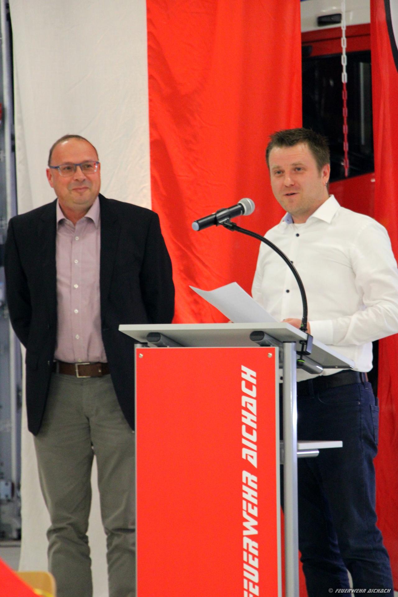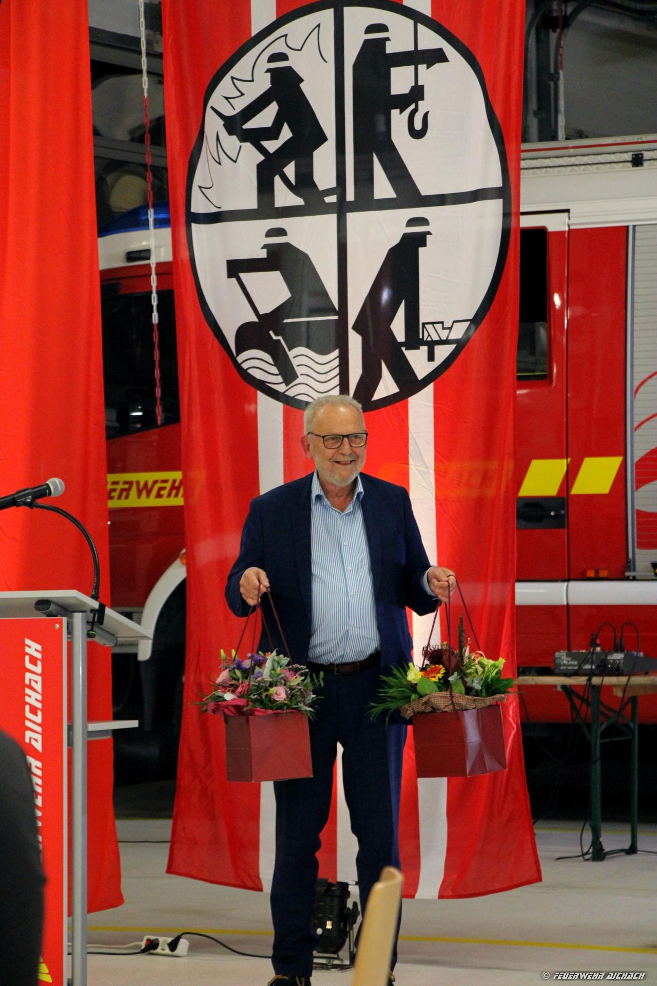 Bürgermeister Habermann betonte in seinem Grußwort noch die enormen Anschaffungskosten von ca. 550.000€, „Für dieses Geld haben wir früher eine Drehleiter gekauft“. Traditionsgemäß überbrachte Habermann an diesem Abend zwei Damen ein Blumenbukett als Dank für die Unterstützung innerhalb der Feuerwehr. Die Grußworte des Feuerwehrreferenten und des Kreisbrandrats rundeten diesen offiziellen Teil ab.