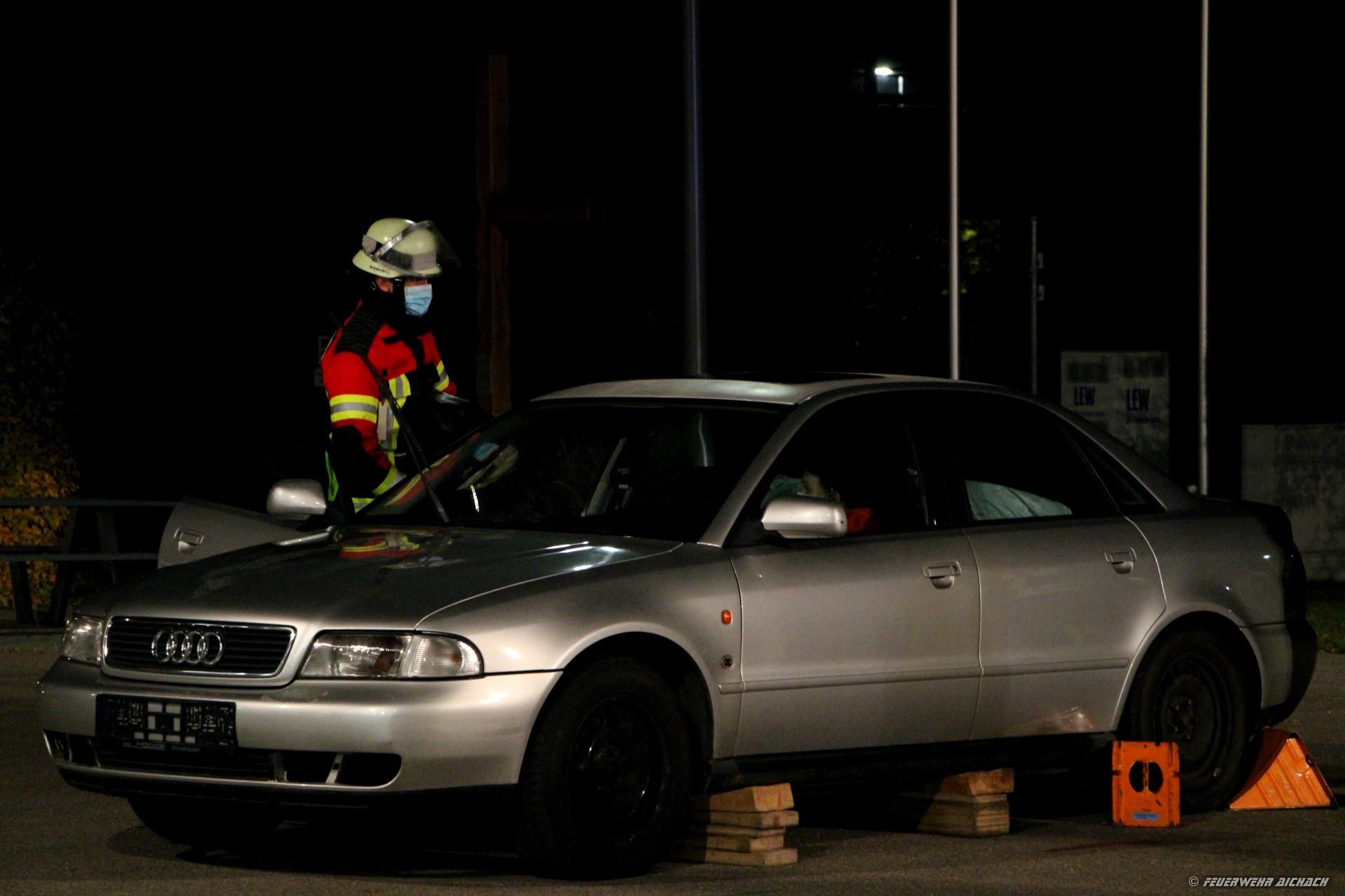 Am Freitag den 29. Oktober fand die Abnahme des Leistungsabzeichens „Die Gruppe im Hilfeleistungseinsatz“ statt. Bei dieser Prüfung gilt es, das Können der Feuerwehrangehörigen bei einem angenommenen Verkehrsunfall mit einer eingeklemmten, verletzten Person zu beweisen. Neben dem Befreien und Retten der eingeklemmten Person wird hier ein besonderes Augenmerk auf die Absicherung von Einsatzstellen sowie dem Sicherstellen des Brandschutzes gelegt. Ebenso wird in abzuarbeitenden Trupp-Aufgaben die Teamarbeit geprüft. Insgesamt traten 16 Teilnehmer in zwei Gruppen mit jeweils 9 Personen in den Funktionen Gruppenführer, Maschinist, Melder, Angriffs-/ Wasser- und Schlauchtrupp zur Prüfung an. Die Abnahme erfolgte durch die Schiedsrichter KBM Peter Schattka und KBM Michael Schlickenrieder.